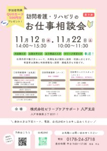 ビリーブケアサポートでは11月に看護師・リハビリ職による相談会を開催します。